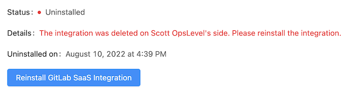 Note: For GitLab Self-Hosted, you may need to update your instance of the OpsLevel app setup in your GitLab instance before reinstalling the app. Please check our current permissions requirements before reinstalling.